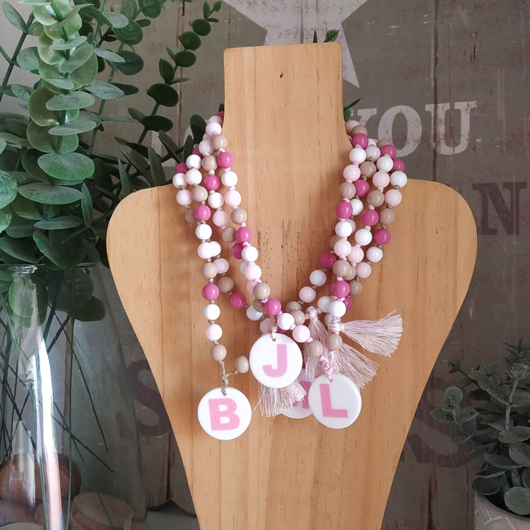 Colar com inicial para bebé ou criança com bolinhas e cordão de algodão. Bolinhas em tons de rosa, bege e branco. A cor do cordão pode variar dentro dos tons do colar.